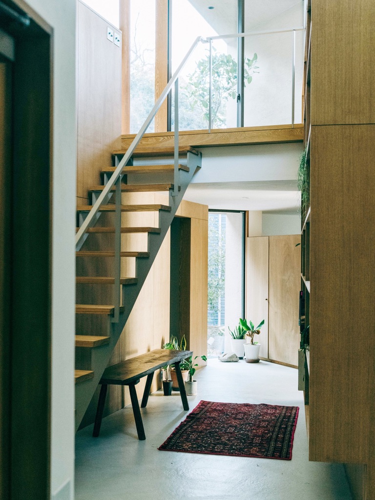 玄関からの見切りが曖昧になることで玄関までが室内の空間の一部になり、より広さを感じる。