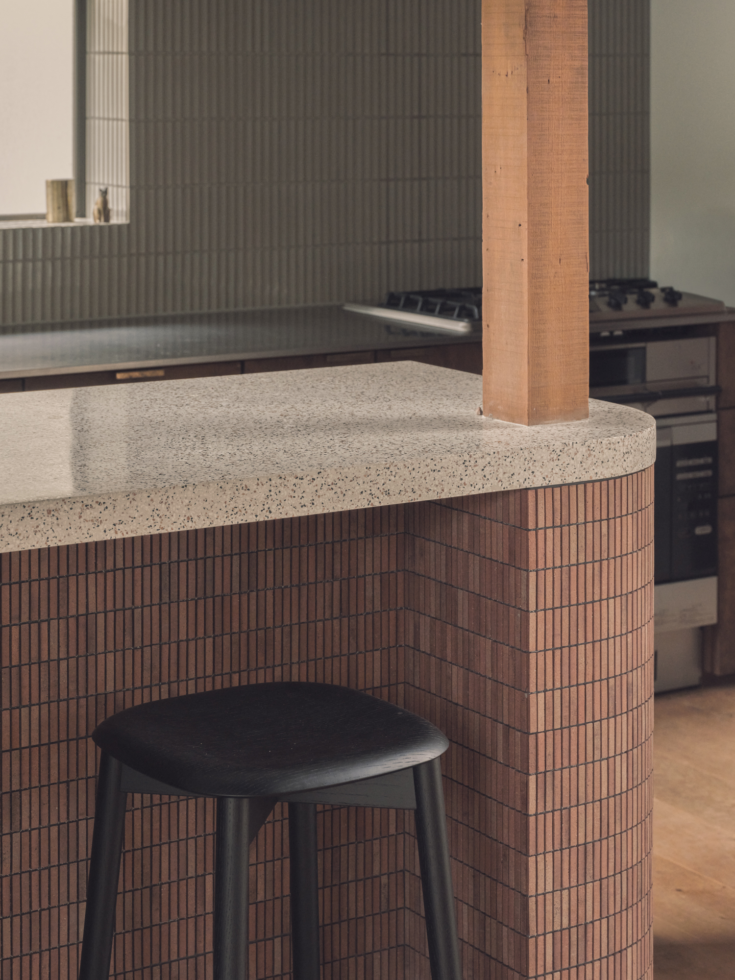 飾り棚はタイルピッチに高さを合わせて間接照明を仕込み、思わず立ちたくなる雰囲気に