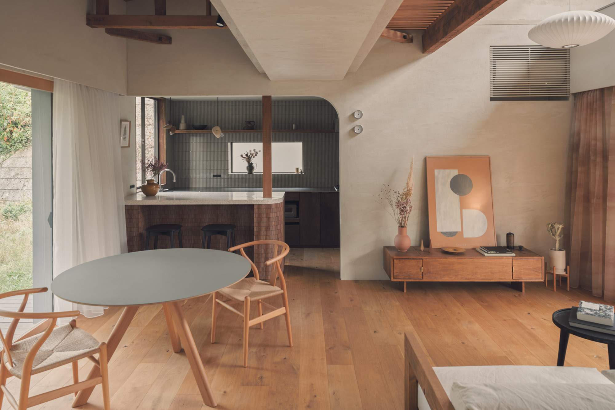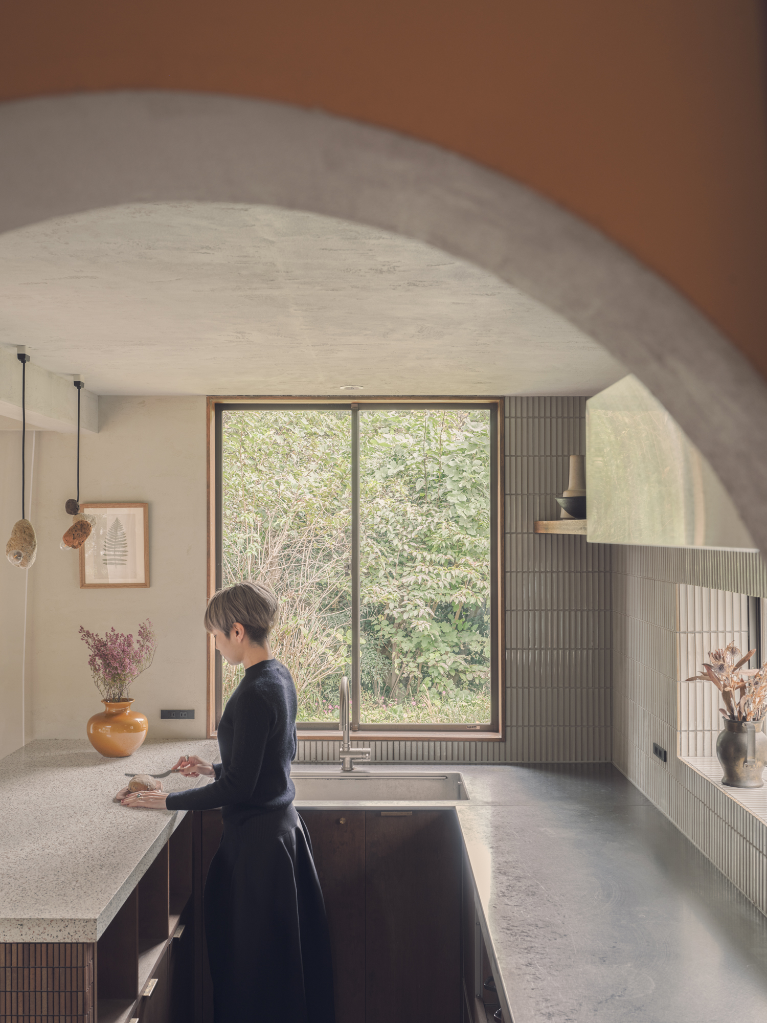 内壁・外壁ともに左官仕上げがメインで相性のいい木やタイルを合わせ温かみある仕上がり