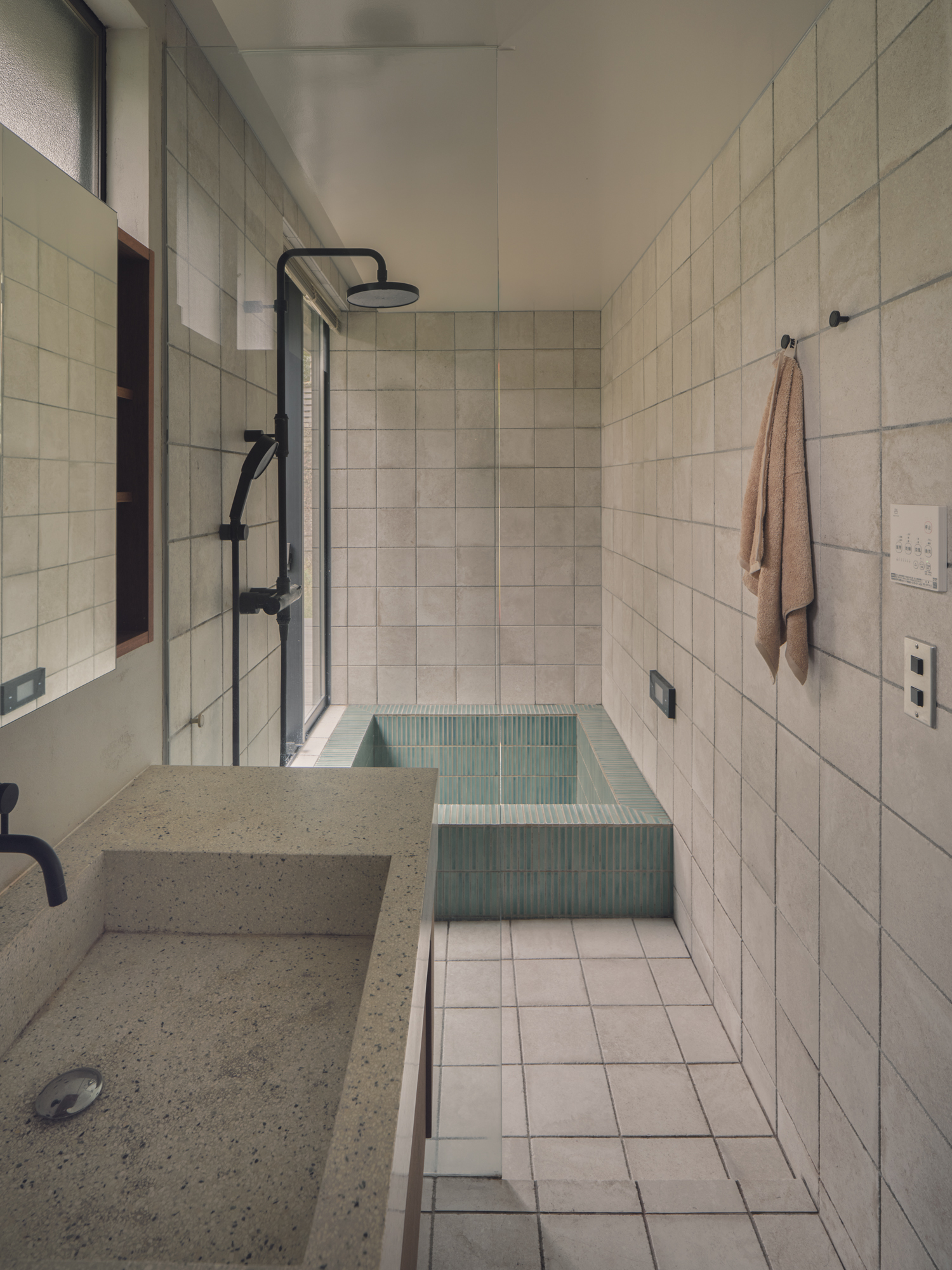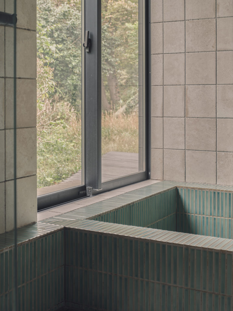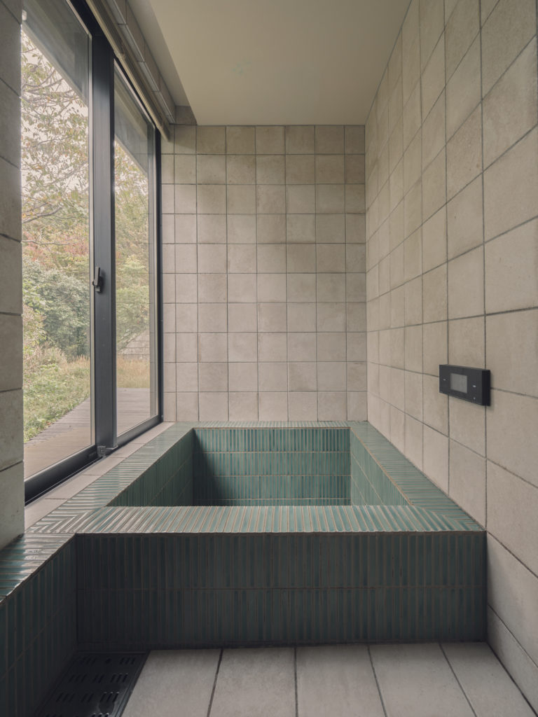 サッシ開口と天井高さを揃えることで、より高さが強調され浴槽に浸かればまるで露天風呂の様です